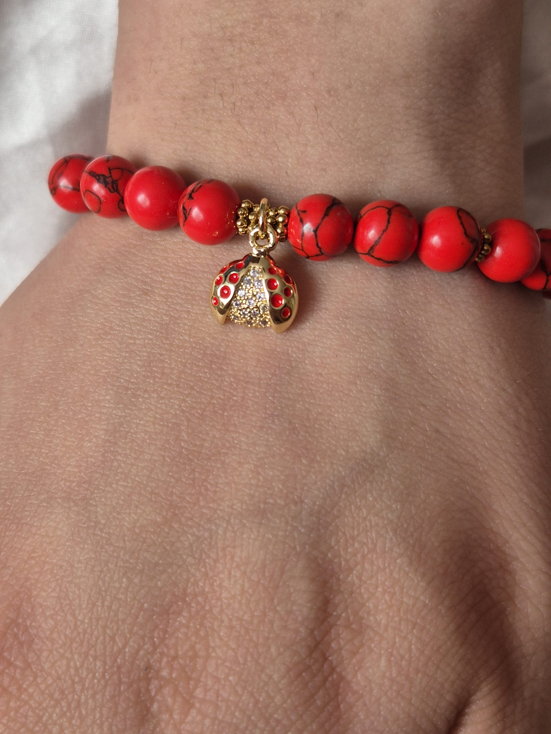 hermosa pulsera de piedra amazonita jaspe roja con detalles de chinita con micro circones, cierre y detalles dorados acero inoxidable chapado en oro,. es un hermoso complemento original y único de Bel joyas que te dará un toque colorido y chic a tus looks